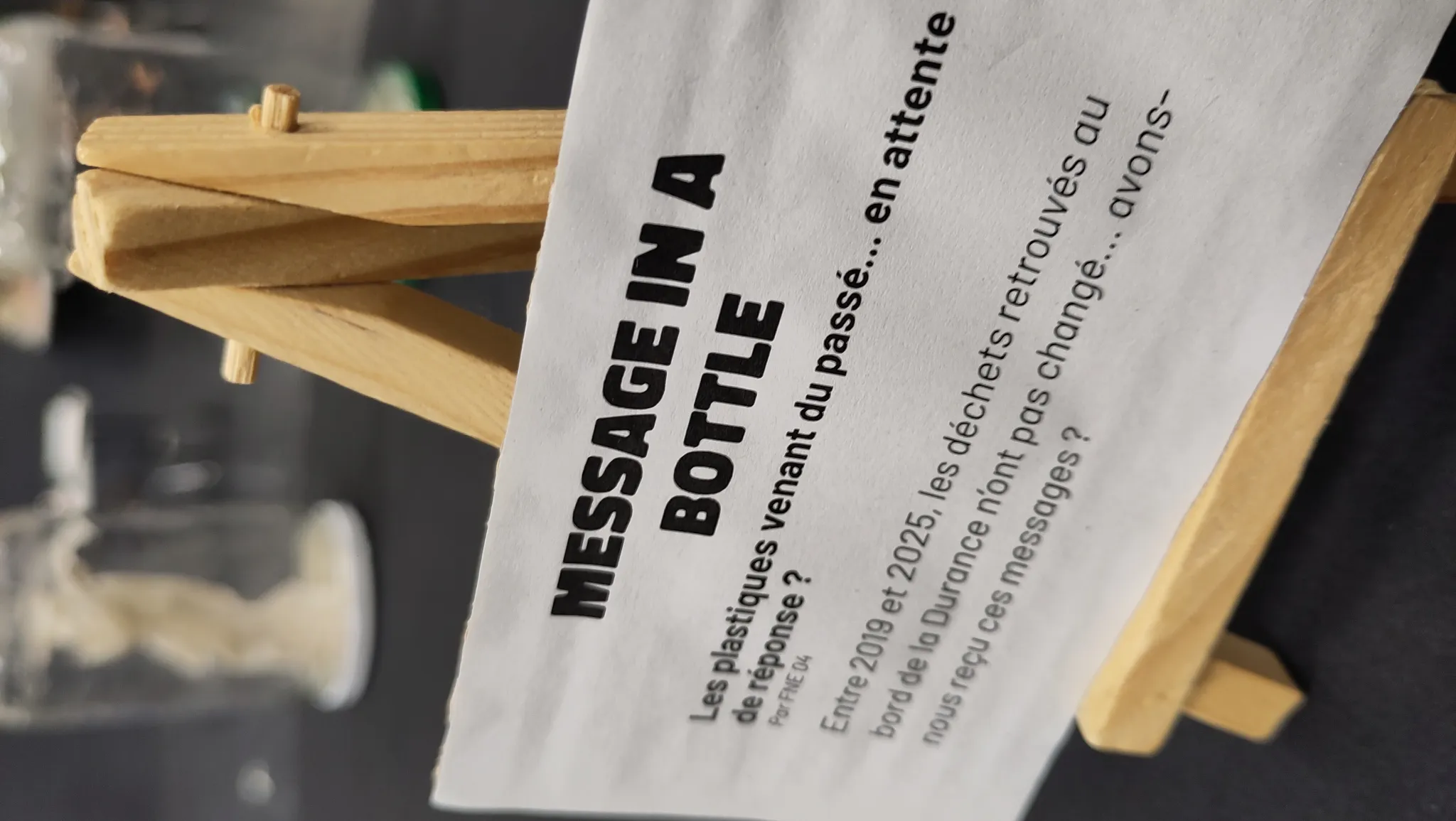 Notre réunion était couplée avec une exposition faite à partir des déchets que nous avions ramassés. Notre mini-musée immersif sur les plastiques de la Durance comportait des œuvres inspirées de notre société de surconsommation et mettait en lumière l’omniprésence des déchets et plus particulièrement des déchets plastiques dans notre quotidien.