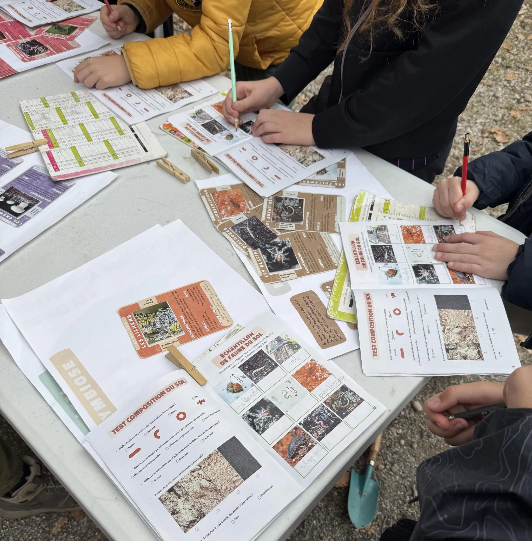 La plupart sont cependant invisibles à l’œil nu, il faut donc les observer avec une loupe binoculaire ou un microscope. Avec un jeu de cartes espèces, les élèves ont pu voir la diversité de la vie dans le sol et la classer en différents groupes.